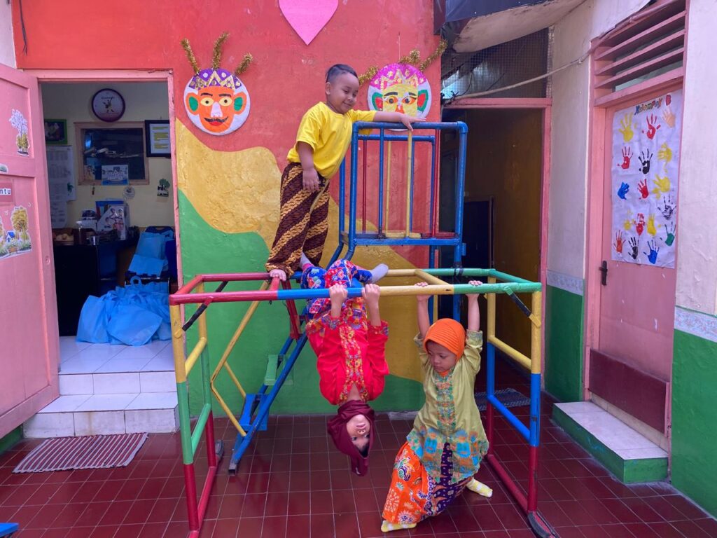 Fatimah dan Haura, dua anak perempuan ini terlihat jungkir balik menaiki permainan besi panjat, bergelantungan dengan bebas. Sementara anak-anak perempuan lainnya bolak balik meluncur dari perosotan. Mereka semua tertawa gembira.